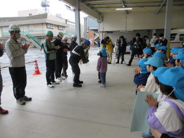 うつぶき保育園の園児から歌のプレゼントと、「除雪のお仕事頑張ってくださいね」という激励の言葉をいただきました。その後、除雪業者を代表して㈱川田建設の川田憲一さんが「中部総合事務所の方と協力して3月まで頑張ります」と決意表明をしました。